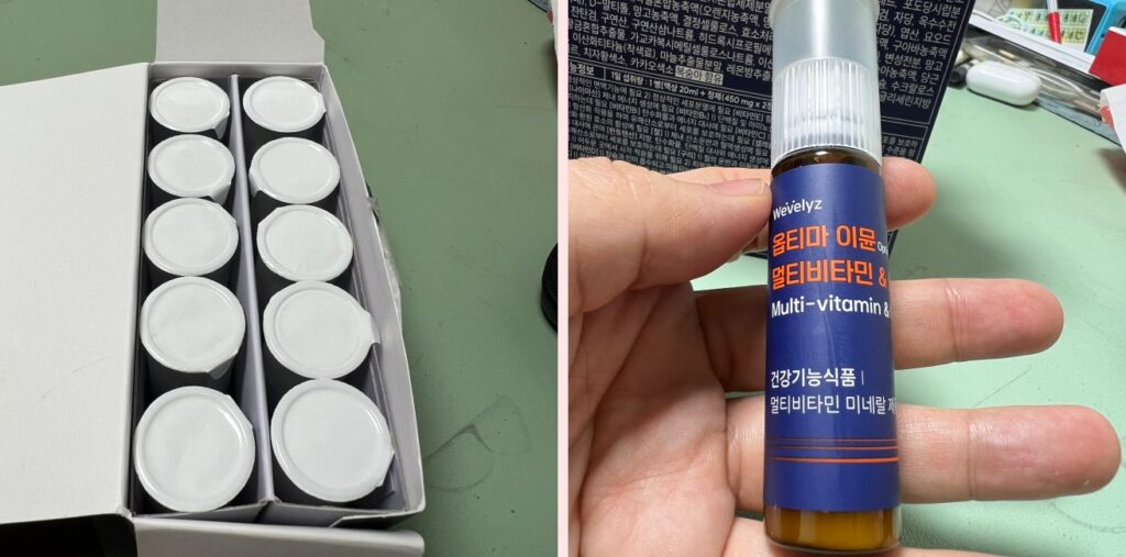 액상 속에는 비타민E, 비타민B6, 비타민B1, 나이아신, 아연 등 5가지의 영양소로 구성되어 있으며 망고피치맛이 납니다. (밑에 가루가 남을 수 있으니까, 잘 흔들어 섞어 드세요.)