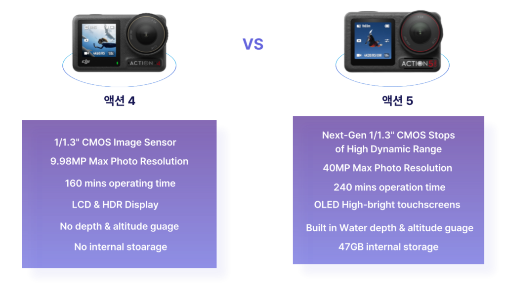 2.DJI 오즈모 액션4와 액션5의 스펙 비교