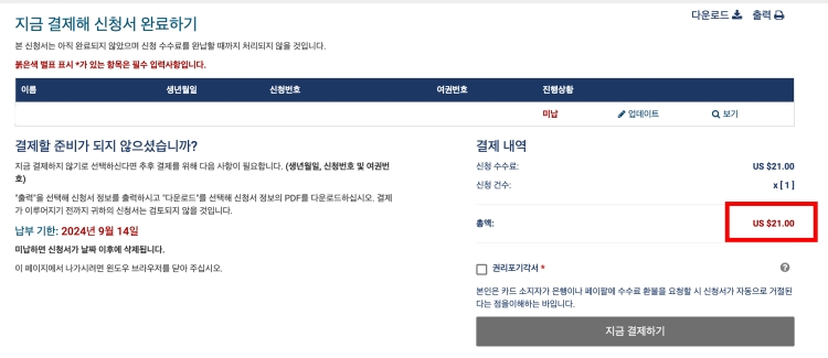 ESTA 발급을 위한 마지막 단계입니다. ESTA 발급에는 수수료 40달러가 필요합니다. 20245 9월 30일부터 21달러에서 현재 가격인 40달러로 변경되었습니다.